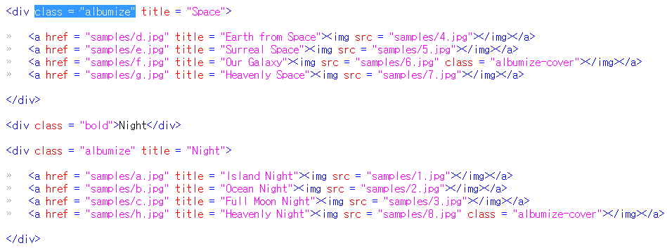 4) ¾Æ·¡¿Í °°ÀÌ class ¸íÀ» albumize ·Î ÁöÁ¤ÇÏ¿© ¾Ù¹üÀ» »ý¼ºÇÒ ¼ö ÀÖ½À´Ï´Ù